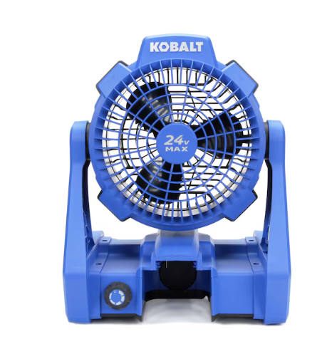 - Hybrid fan that can be run using an electric power cord (extension cord) or a Kobalt 24-volt max battery (both sold separately)